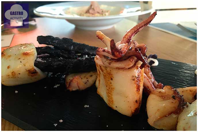 Los lectores del blog ya saben que me encantan los chipirones y que es una parada obligatoria en las cartas de los restaurantes que los tienen. En este caso los del restaurante 90 Grados son Chipirones de anzuelo con tempura en su tinta. Chipirones a la plancha muy ricos, con una guarnición muy original que me ha encantado: verduras en tempura con la tinta del chipirón.