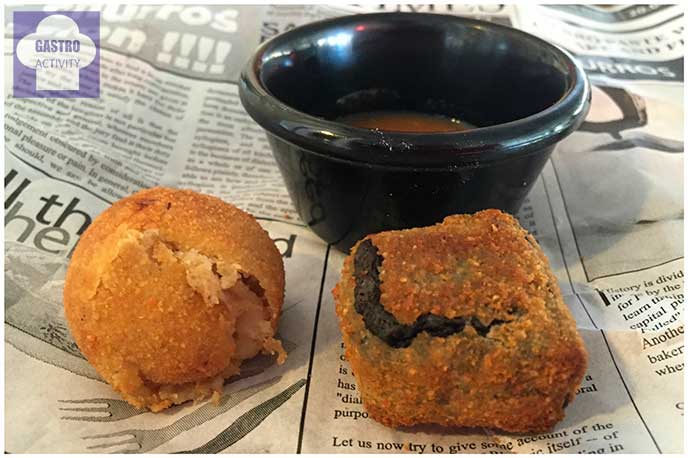 Las croquetas no pueden faltar. Únicamente dos sabores. Las Croquetas de chipirón, elaboradas con su tinta y en las que te encuentras los trocitos de los chipirones y las Croquetas de carrillera, que sirven con una salsa espectacular elaborada con la carrillera, para que las mojes en ella.